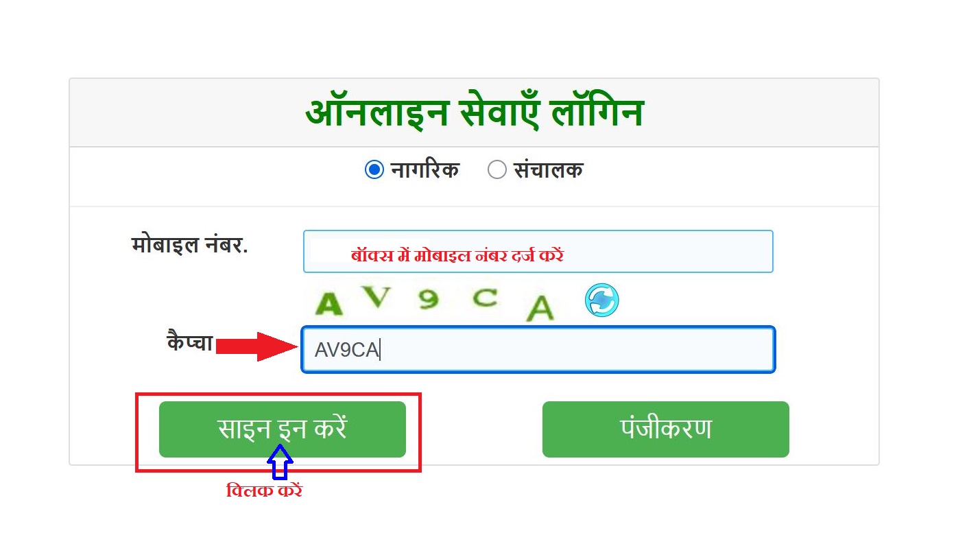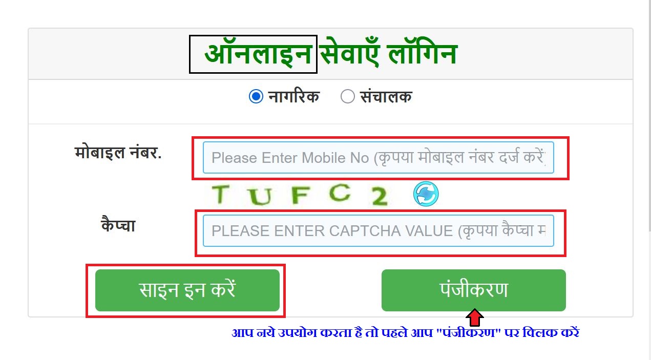 नीचे दी गई किसी भी ऑनलाइन सेवा का लाभ उठाने के लिए कृपया अपने मोबाइल नंबर से लॉगिन करें। यदि आप नए उपयोगकर्ता हैं, तो कृपया नीचे दिए गए लिंक पर क्लिक करके पहले पंजीकरण करें।