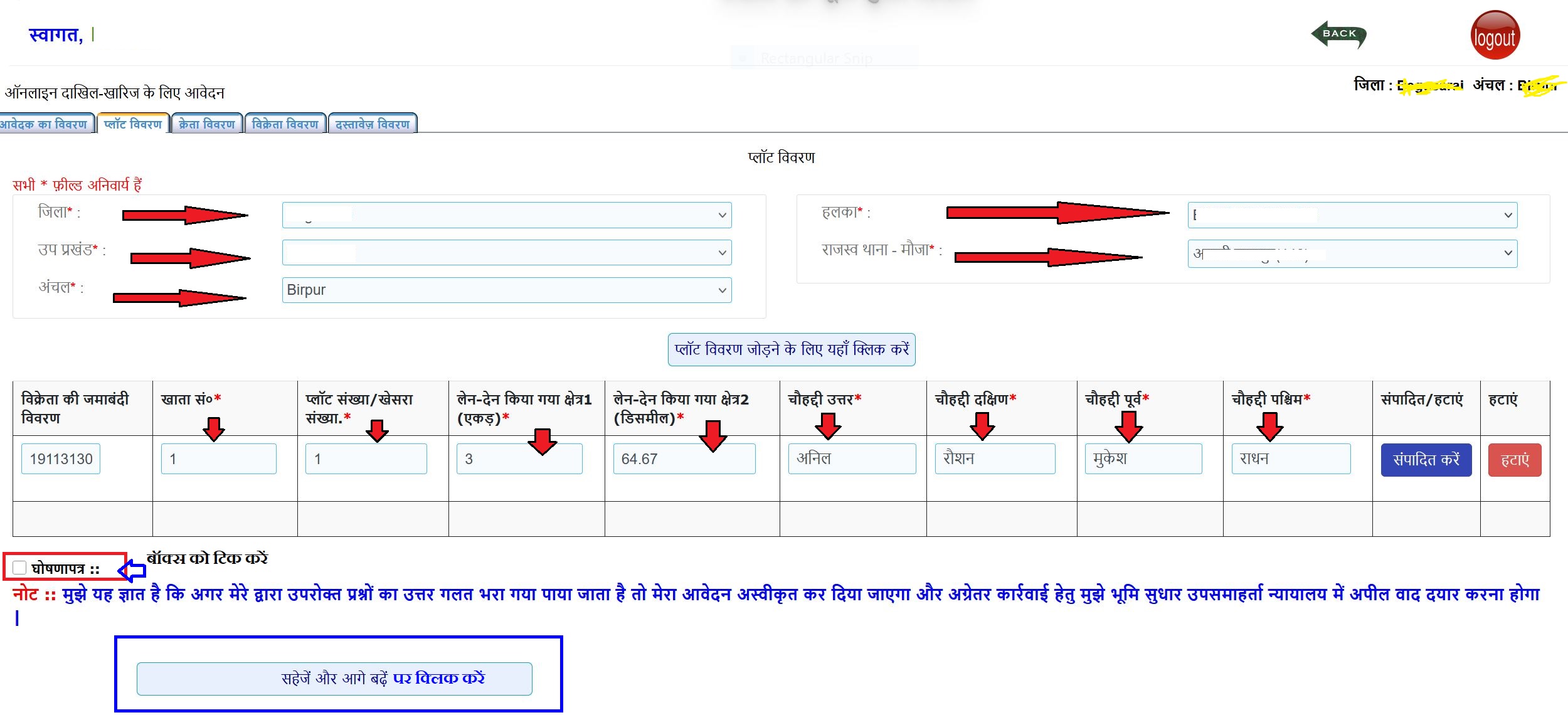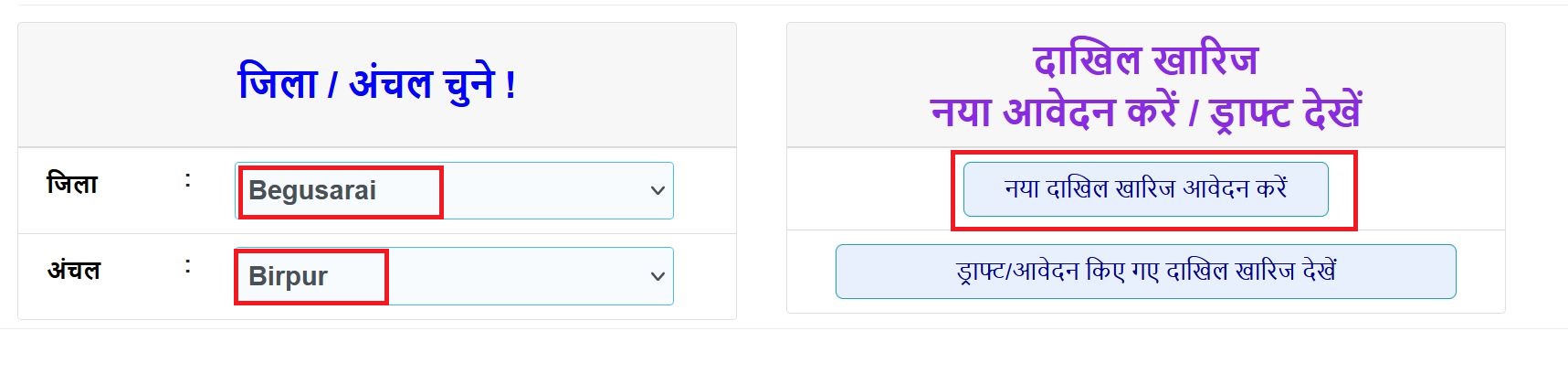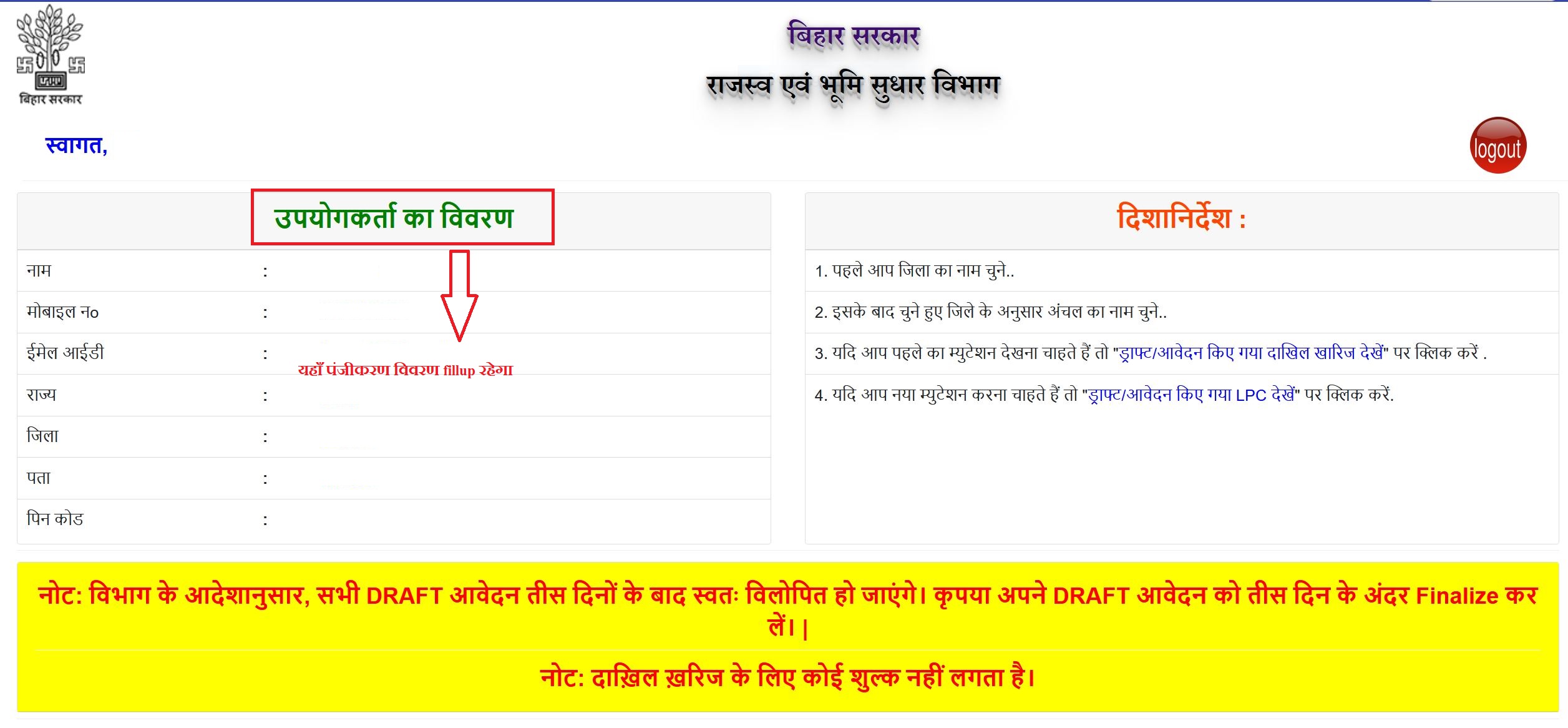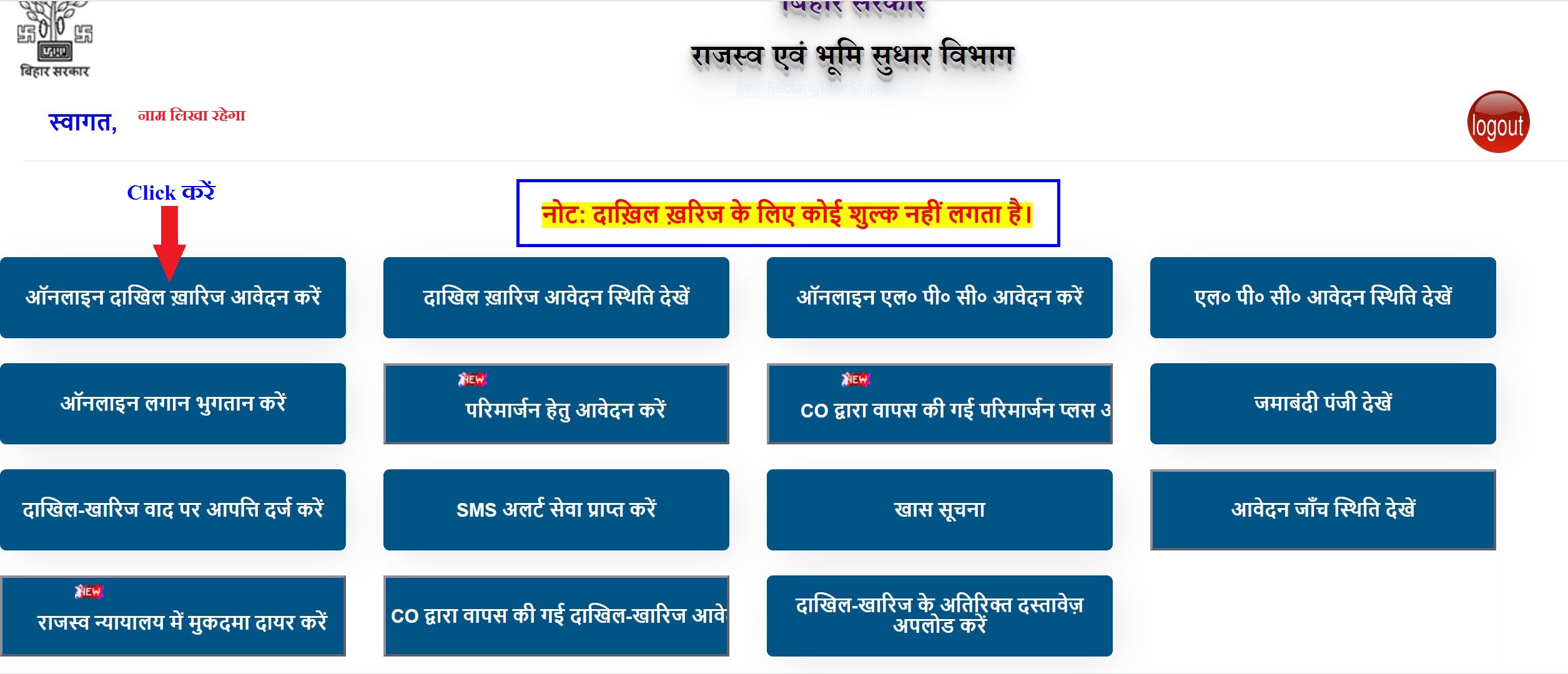 अतिआवश्यक सूचना:-दाखिल-खारिज हेतु आवेदन करने वाले रैयतों से अनुरोध है की आवेदन से पहले “विक्रेता/ पूर्व के जमाबंदी रैयत” जिसकी जमाबंदी से भूमि खारिज होनी है को ऑनलाइन पोर्टल पर देख लें। अगर दाखिल-खारिज होने वाले भूमि का विवरण “विक्रेता/ पूर्व के जमाबंदी रैयत” की जमाबंदी में नहीं है तो पहले परिमार्जन के माध्यम से “विक्रेता/ पूर्व के जमाबंदी रैयत” की जमाबंदी की सुधार करवाएँ। तत्पश्चात भूमि के दाखिल खारिज हेतु आवेदन करें।