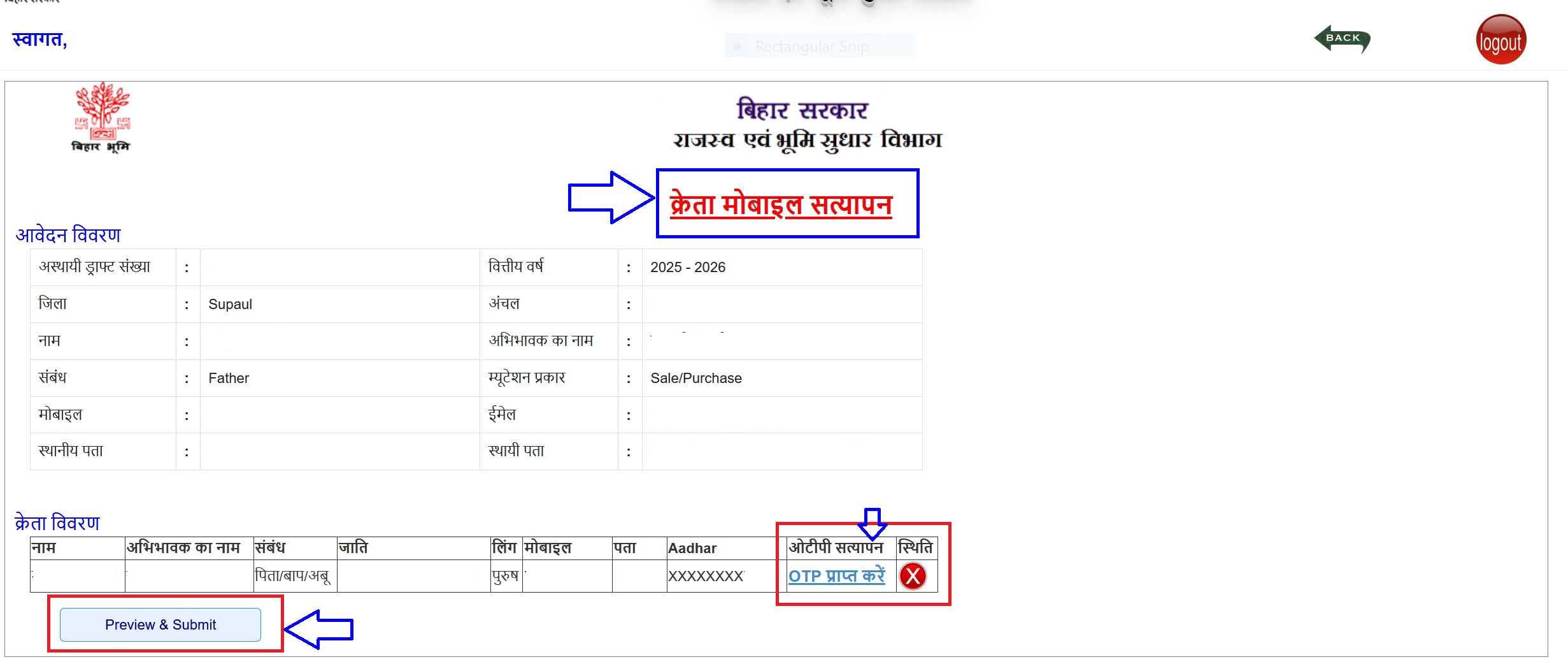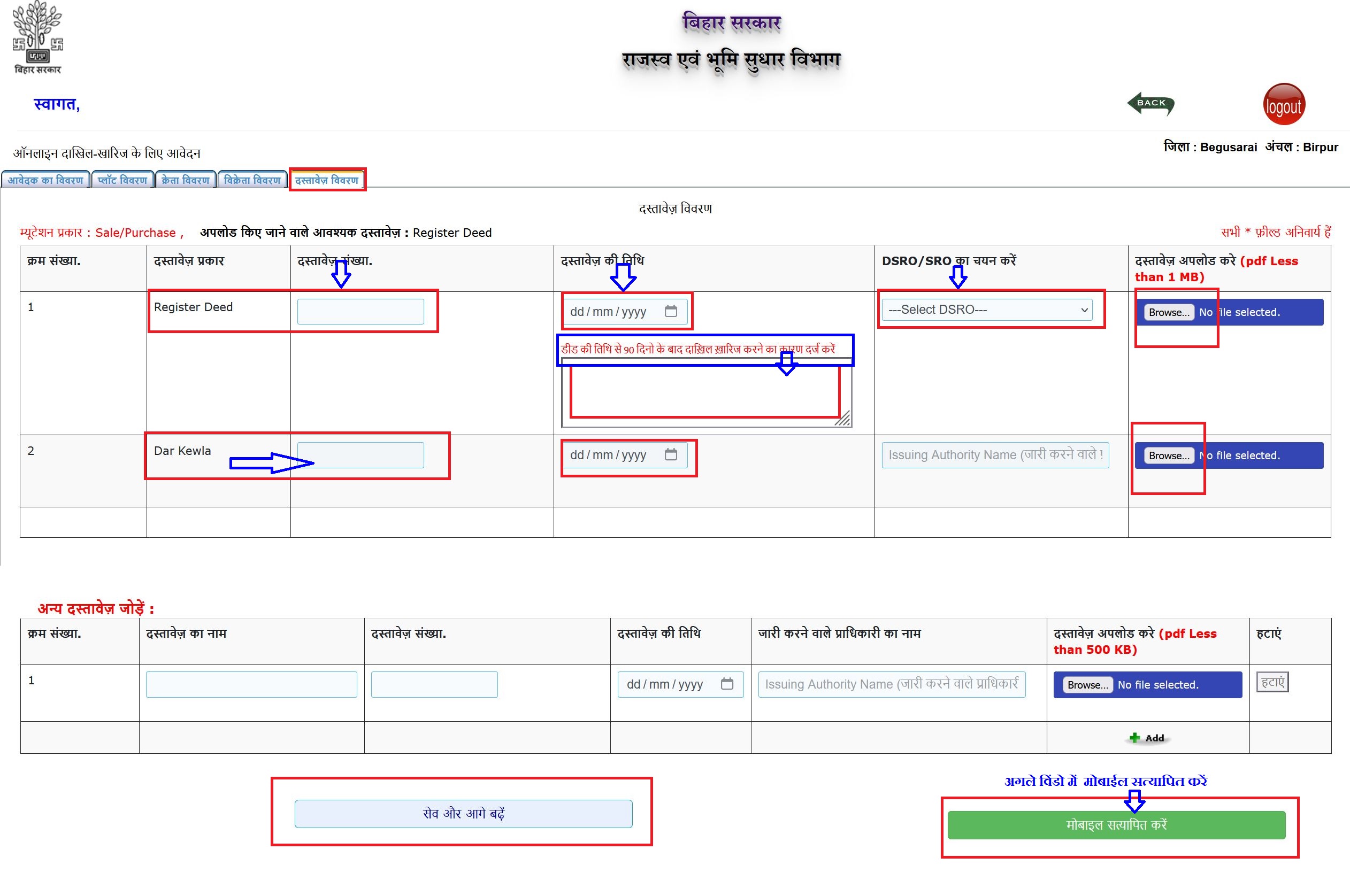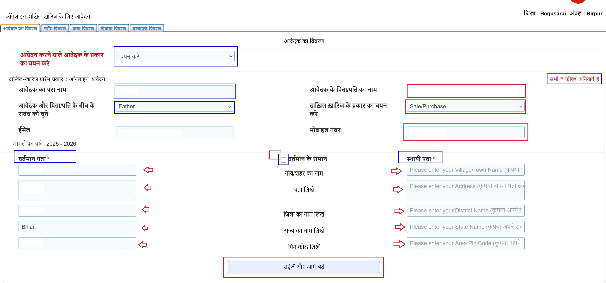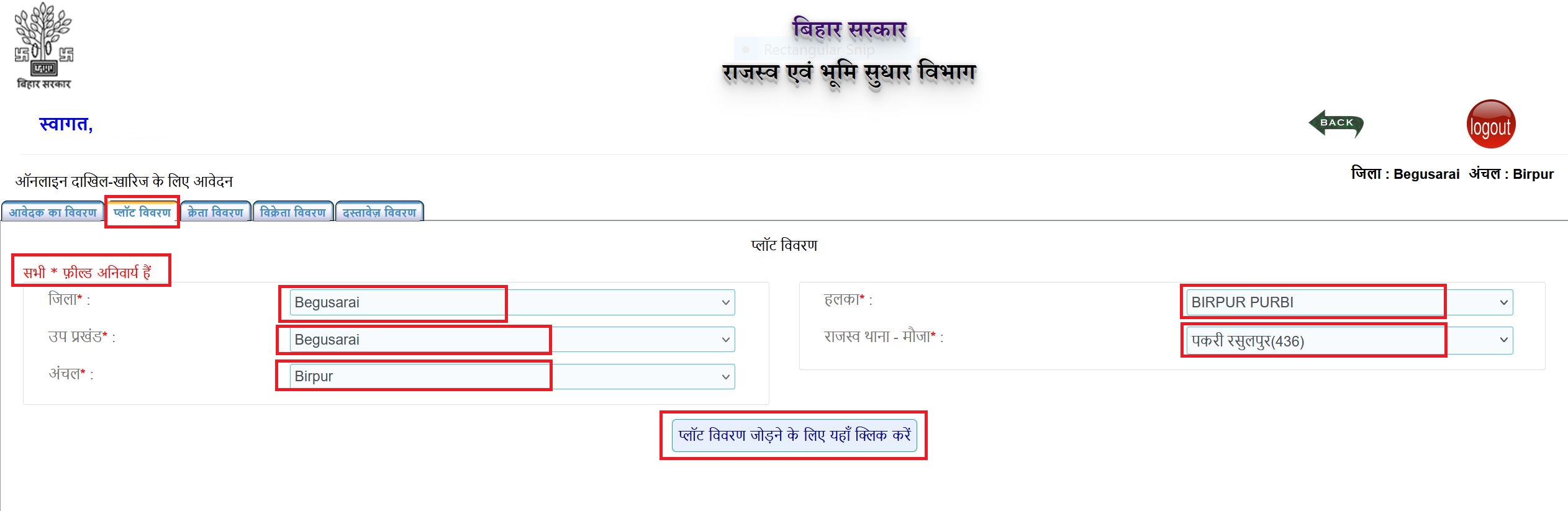 अतिआवश्यक सूचना:-दाखिल-खारिज हेतु आवेदन करने वाले रैयतों से अनुरोध है की आवेदन से पहले “विक्रेता/ पूर्व के जमाबंदी रैयत” जिसकी जमाबंदी से भूमि खारिज होनी है को ऑनलाइन पोर्टल पर देख लें। अगर दाखिल-खारिज होने वाले भूमि का विवरण “विक्रेता/ पूर्व के जमाबंदी रैयत” की जमाबंदी में नहीं है तो पहले परिमार्जन के माध्यम से “विक्रेता/ पूर्व के जमाबंदी रैयत” की जमाबंदी की सुधार करवाएँ। तत्पश्चात भूमि के दाखिल खारिज हेतु आवेदन करें।