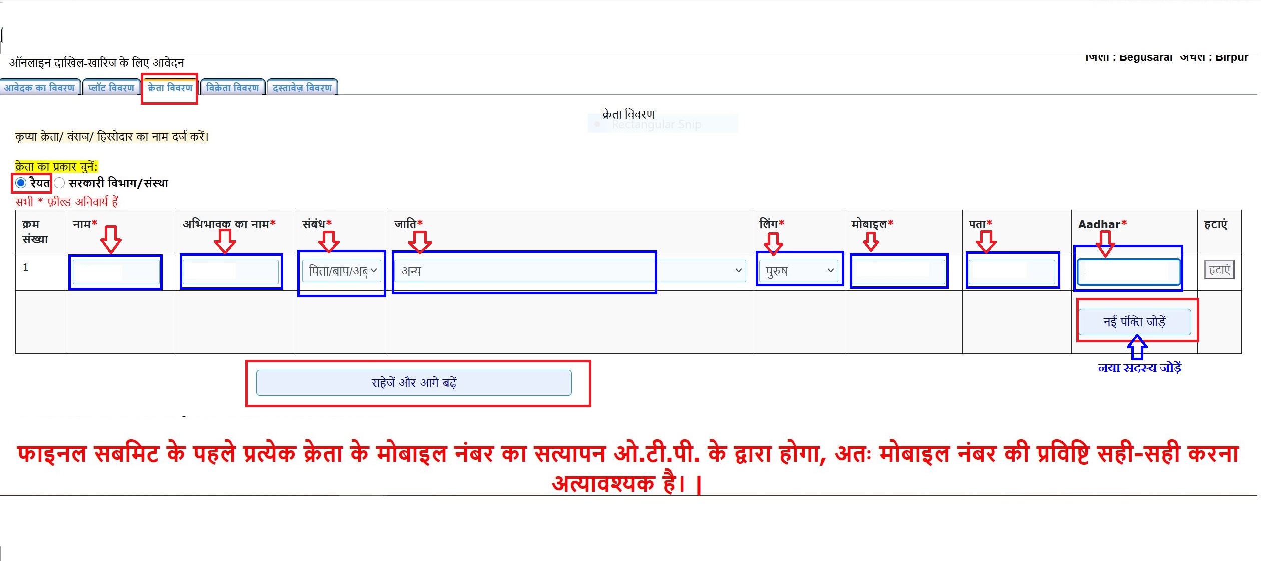 - छठे बॉक्स मे क्रेता अपना मोबाइल नंबर लिखे…