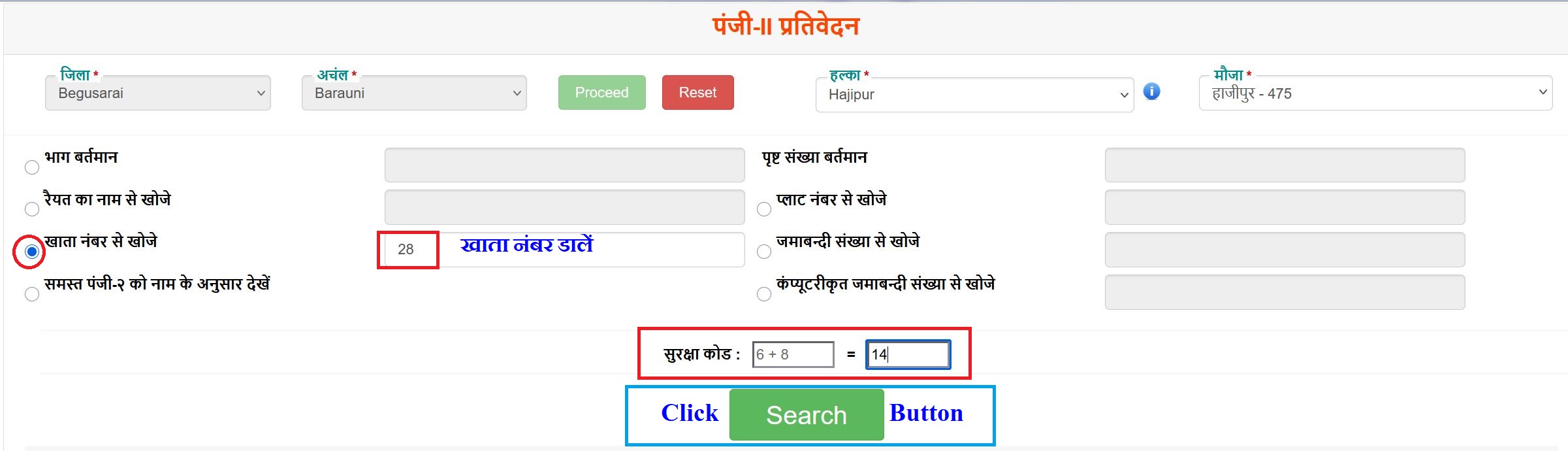 4. आप अपने सुविधा अनुसार किसी एक को चयन करें यहाँ पर खाता नंबर से खोजे को select किया गया है । बॉक्स में खाता नंबर डालें, सुरक्षा कोड डालें उसके बाद Search पर क्लिक करें । जैसा की इमेज में दिखया गया है ।
